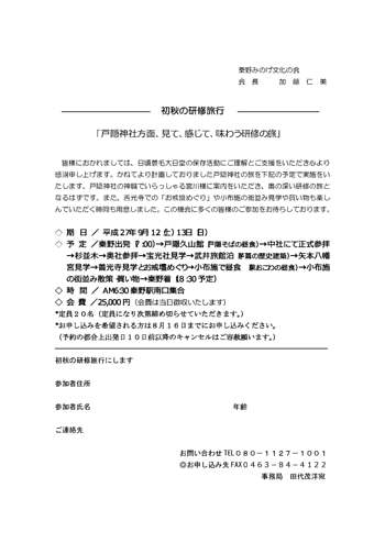 かねてより計画しておりました戸隠神社の旅を下記の予定で実施い たします。戸隠神社の神職でいらっしゃる宮川様に案内をいただき、奥の深い研修の旅と なるはずです。また、善光寺での「お戒壇めぐり」や小布施の街並み見学や買い物も楽し んでいただく時間も用意しました。この機会に多くの皆様のご参加をお待ちしております。◇期 日 / 平成27年9月12(土), 13日(日)