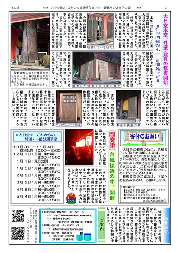 閻魔詣の案内と大日堂本堂の外壁・建具の修復工事の開始報告などの記事が記載されています。